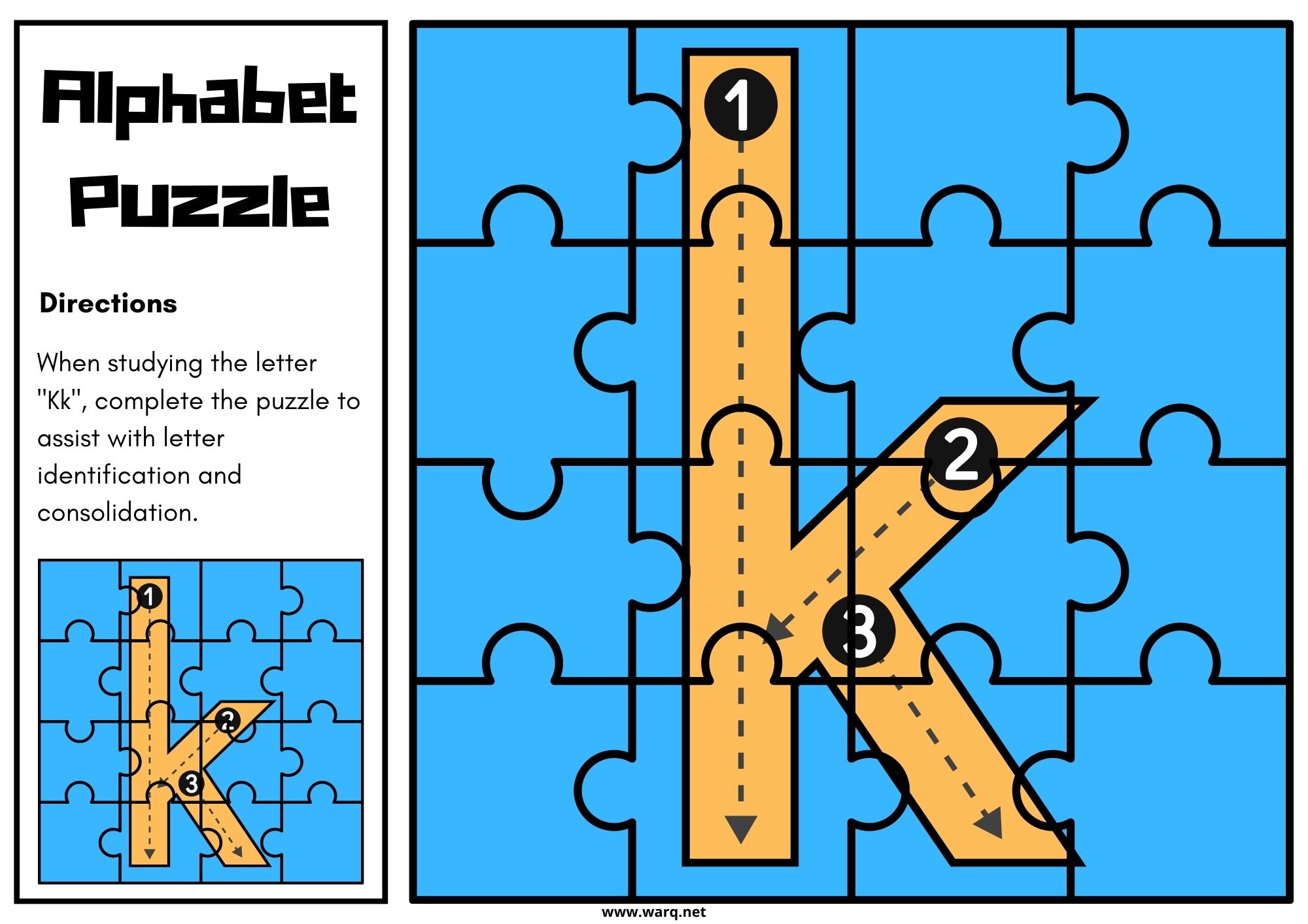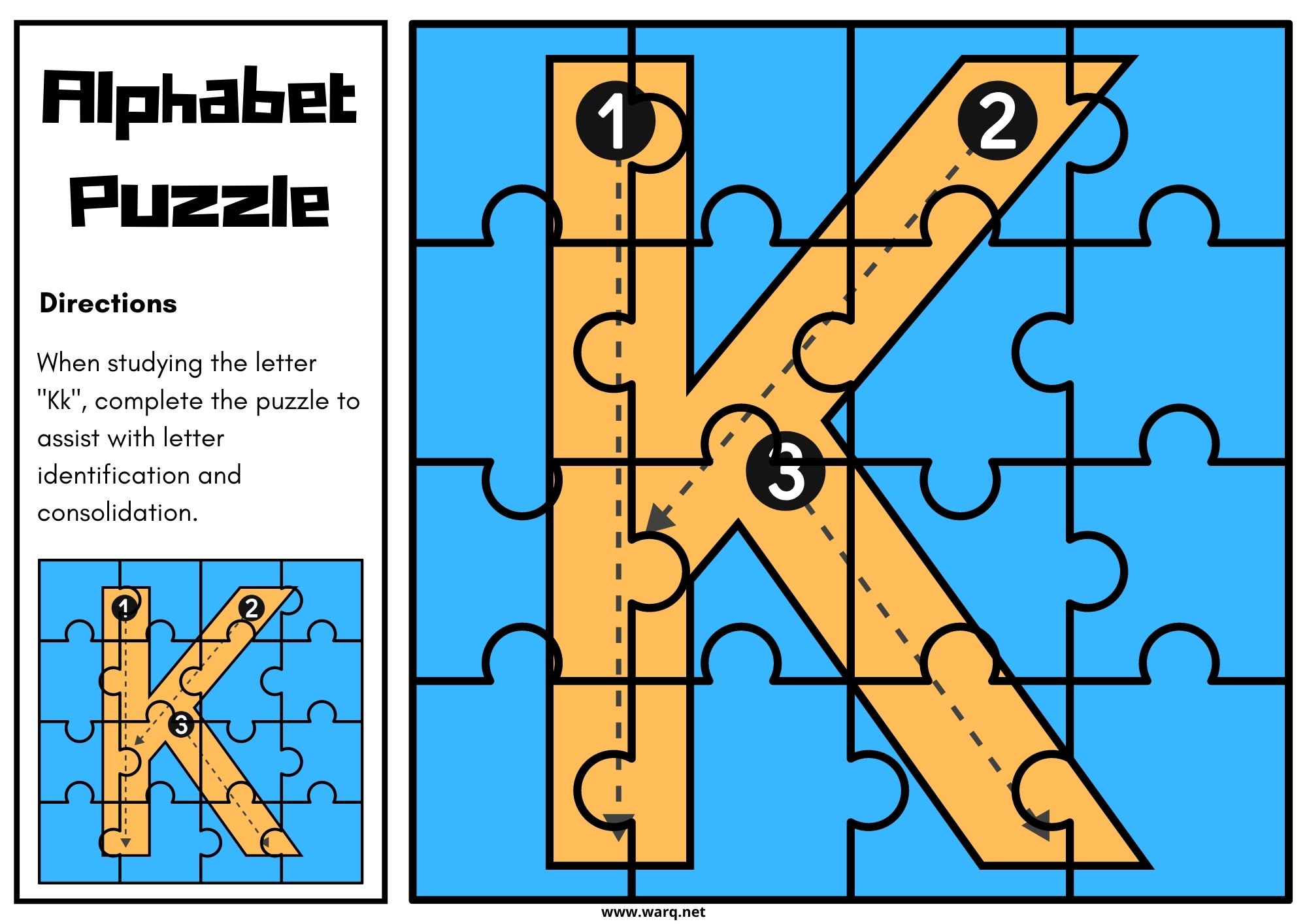 هذا التمرين عبارة عن ألغاز تعليم الحروف الإنجليزية ، بطاقات قص الألغاز وبطاقات أخري للصق القصصات لتكوين letter K .