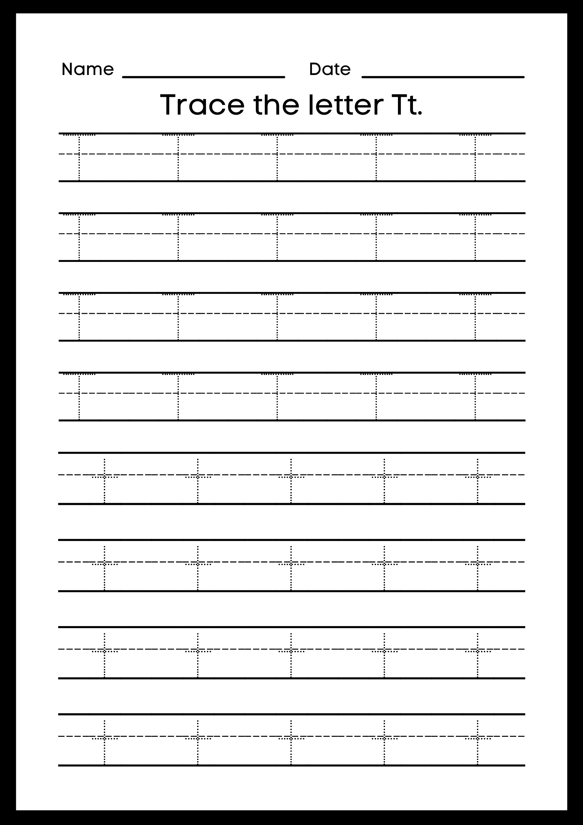 تعدد تمارين كتابة Letter T بأكثر من طريقه وشكل يجعل تمكن طفلك من تعلم الحروف الإنجليزية Letter T بشكل أسرع.