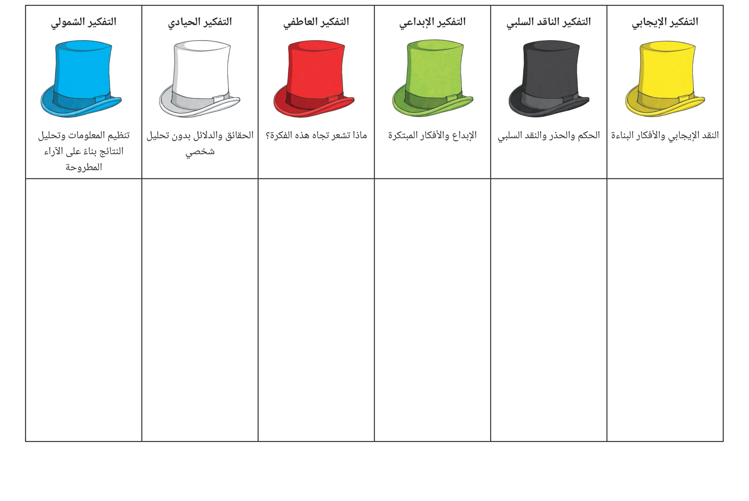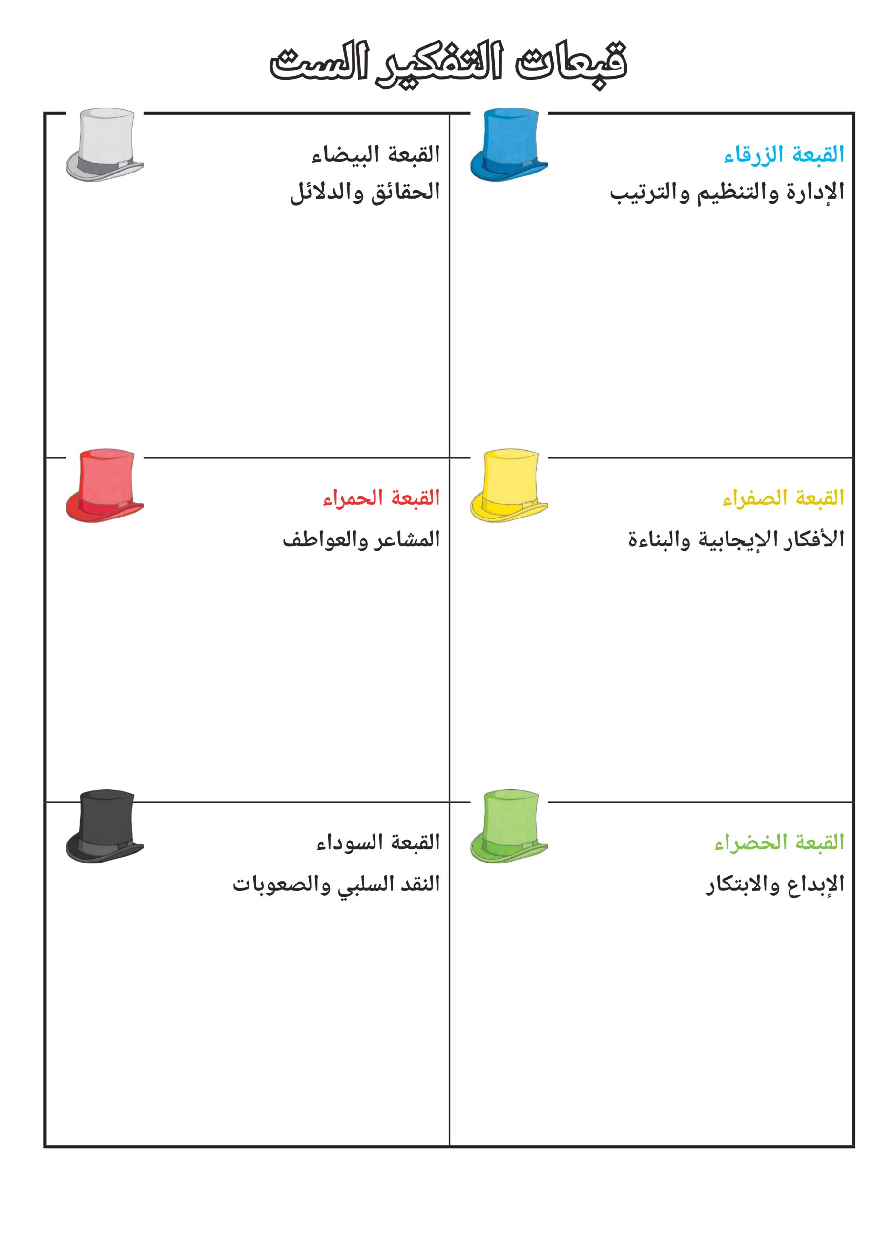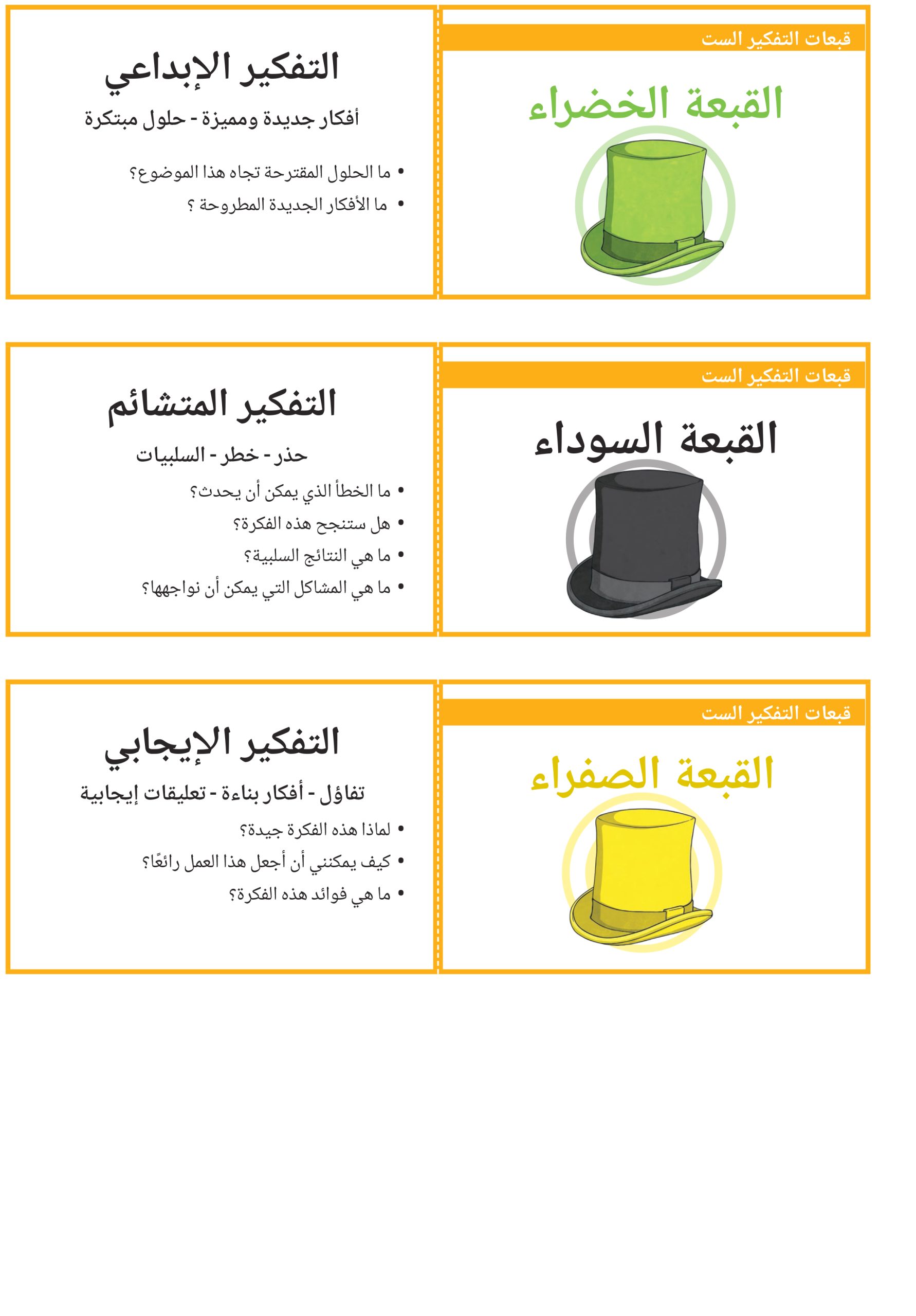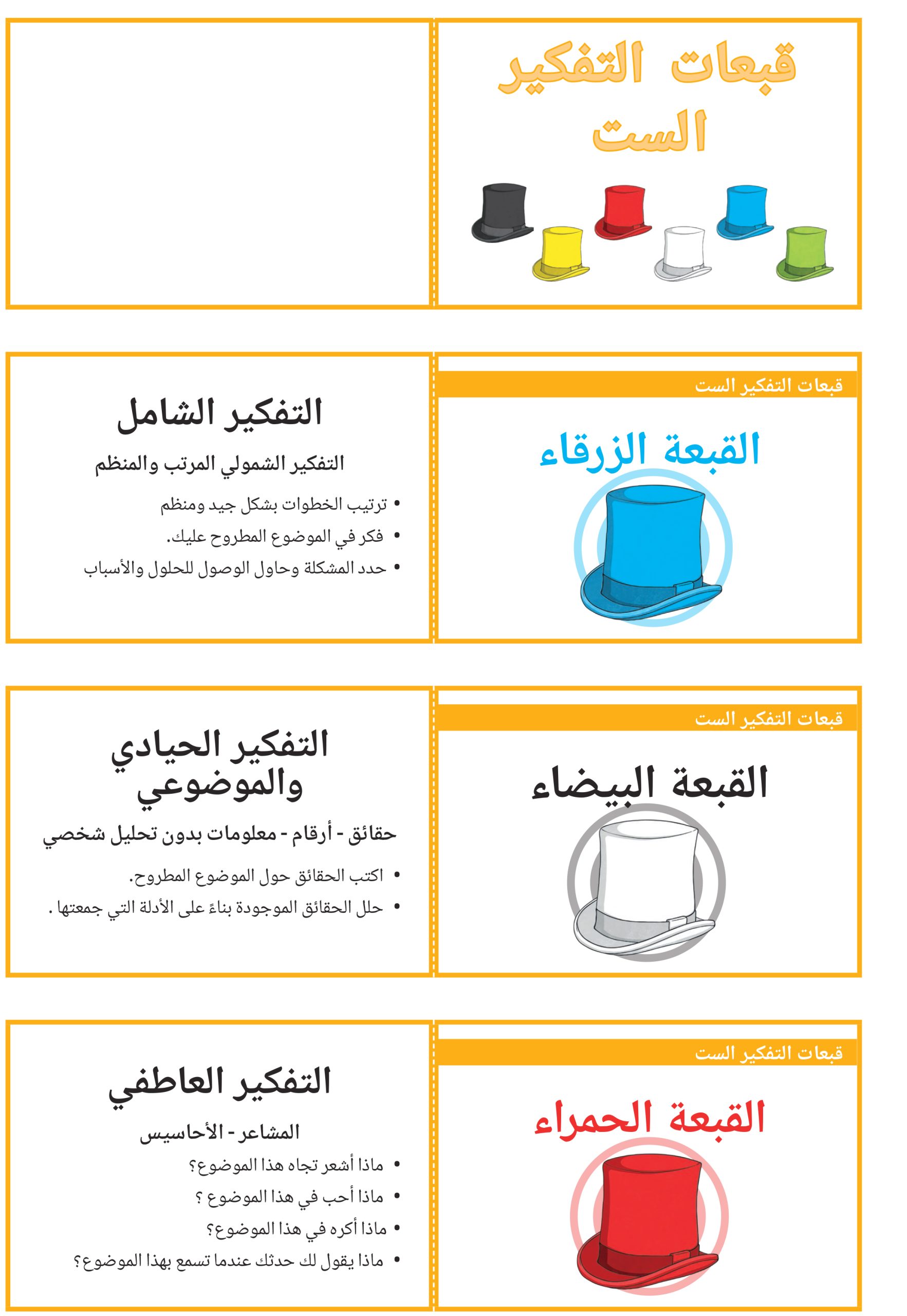 بطاقات تعليمية قبعات التفكير الست